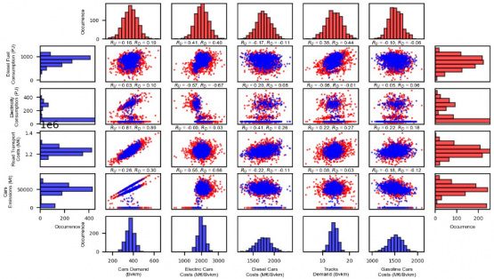 Fig. 13. Probability distributions of the five most important inputs for the transport sector, probability distributions for a selection of transport sector outputs and scatter plots and correlation coefficients ( for Base_Uniform, for Base_Different) for the couples of inputs and outputs in the Base_Uniform (blue items) and Base_Different (red items) samplings.