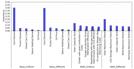 Fig. 8. Ranking and importance values of the five most important inputs in determining the model objective function taken as a single output in the four model configurations.